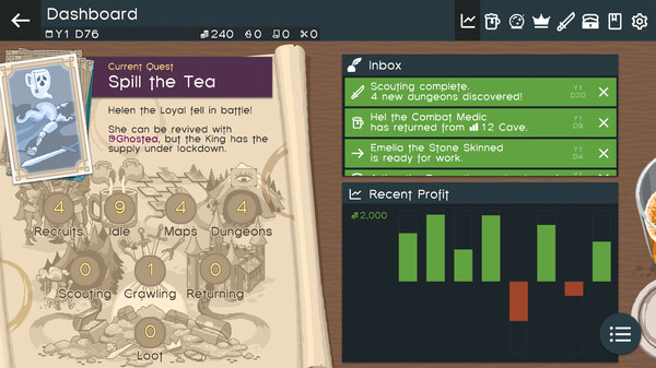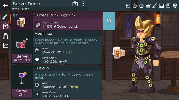 Heroes can't fight if they're thirsty! Serve drinks and chat from behind the bar to unlock new skills and storylines, or perhaps negotiate a better rate for their services. Consult personnel records and charts to identify and reward standout performers.More Than a Roguelike