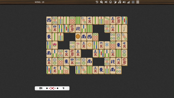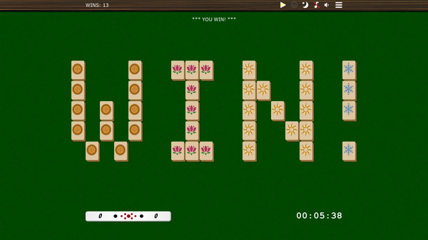 The classic game has 144 Mahjong tiles laid out flat in an 18 x 8 rectangle. Match pairs of tiles to clear the board. Tiles can be matched by a single straight line, a line with one bend, or a line with two bends. A tile from the Seasons or Flowers suits can be matched with any other tile of its type.