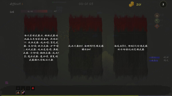 The weapon system of this game is more like the linkage between legendary equipment and corresponding skills in Diablo III. By enhancing weapons to obtain special effects (similar to legendary equipment affixes), you can construct your weapon system through special effects, such as triggering high cooling and high damage weapons with high-frequency and low damage weapons, or building weapon loops (the release of one weapon triggers the release of other weapons, and then triggers the weapon again through the special effects of other weapons to form a loop)
