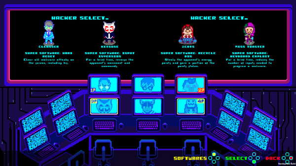 Each playable character has its own background story, motivations and Super Software. Battles occurs in a variety of locations, each stage has different features, as number of PCs, connections and hazards. Take every aspect of the match to become victorious.