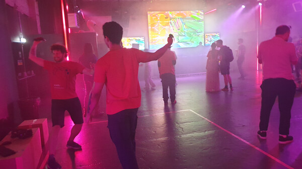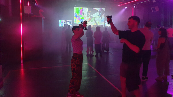 Put your VR headset to the side, where its still visible to the trackers. Then turn up your volume, so you can hear the game.Finally give each player one of the controllers. Now you are ready to go!