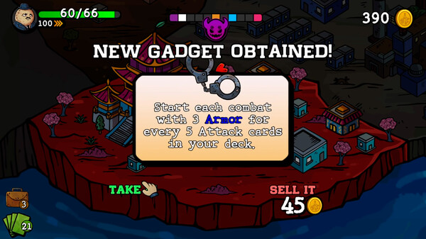 Equip several gadgets! Throughout the city you will discover powerful items that improve your deck and may create interesting synergies...