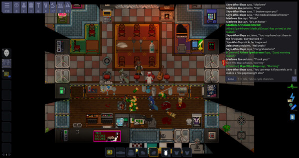 Work together to survive as long as possible. Once the station is destroyed beyond repair, command will call in the shuttle to evacuate everyone and everything starts all over again. How long can your crew last?