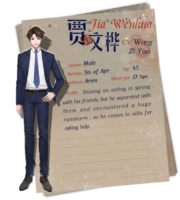 You are a third-rate novelist, with a pseudonym— Holmes, but the other side of the cheap pseudonym is your serious and fervent heart for reasoning. In this murderous villa, you will be the detective role and unremittingly pursue the truth. Find out the real murderer and disclose the truth.