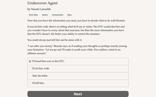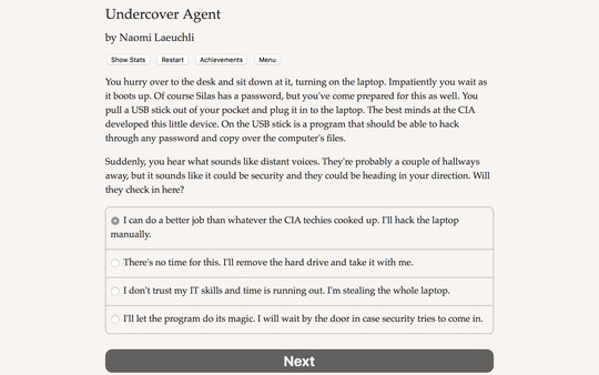 Undercover Agent is an interactive novel by Naomi Laeuchli. It's entirely text-based--135,000 words, without graphics or sound effects--and fueled by the vast, unstoppable power of your imagination.
