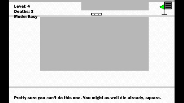 The game has Squares Rage is a minimalist style puzzle / "rage" game, in which the player is a square who must navigate through a series of puzzles that get increasingly more difficult. Use the arrow keys to navigate the square to the flag at the end of the level in as few deaths as possible! Press 'S' to self-destruct (if you need to)!