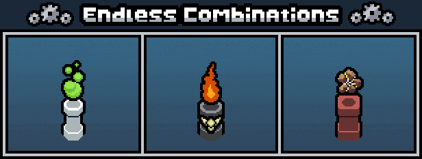 Create your own custom towers by choosing and combining randomized upgrades. There is a near infinite amount of upgrade combinations available. Would you like your Ice Tower to shoot multiple projectiles at once? An anti-air tower that applies a burning effect? Lightning attacks that deal Splash damage and bounce from enemy to enemy? There are over 25 million possible combinations!
