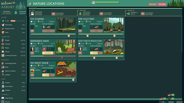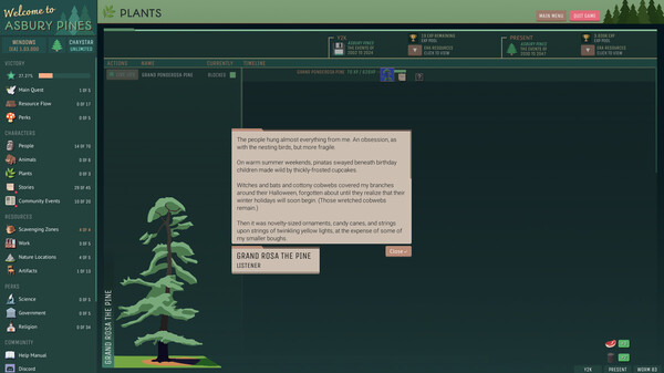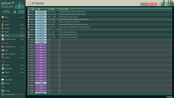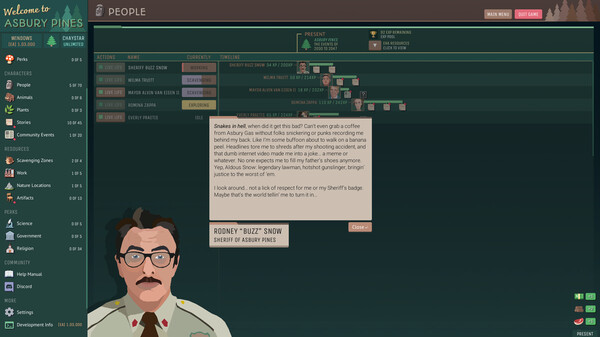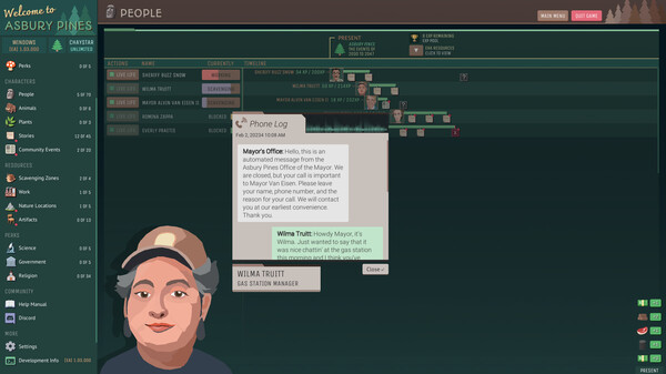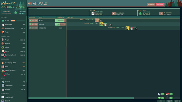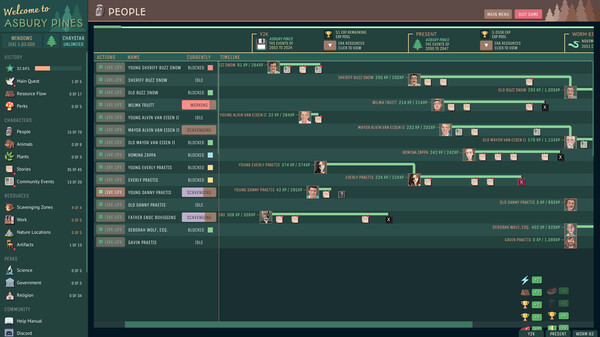 More than 50 people, plants, and animals with unique stats and backgrounds emerge across the history of Asbury Pines. They drive the mystery with their personal stories, age across timelines, and contribute to the resource growth needed to progress.