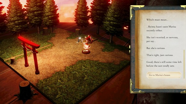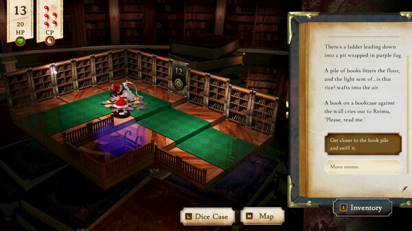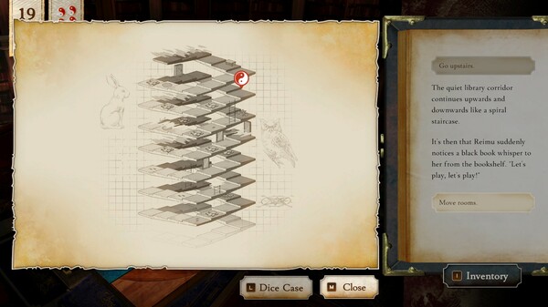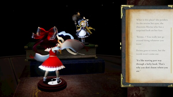 Welcome to a mystic world of adventure, sewn together by a singular magical book. 'Marisa of Liartop Mountain' is an adventure role-playing game that progresses according to the player's decision-making, in addition to the guidance of dice. You, the player, will play as Reimu and explore a mountain of books filled with mysteries and lies in search of the whereabouts of the missing Marisa.