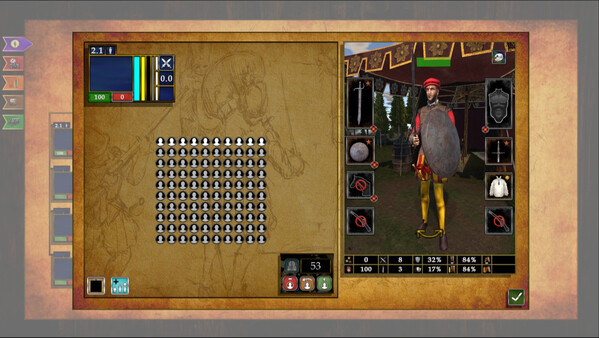 • Manage and organise your army as you see fit: equip your soldiers, fulfill their health and morale needs, and carry out training.