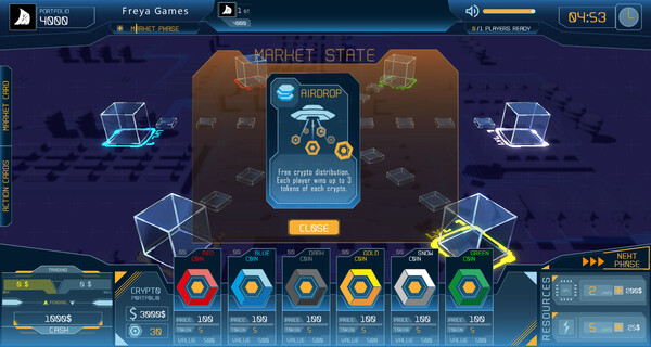 Action and Market Cards: Play cards that can influence market prices, attack your opponents, or protect your investments. Automatically drawn Market cards impact the overall economy, while player Action cards target specific cryptocurrencies.