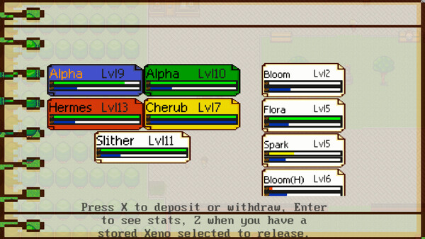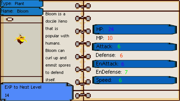 The game has This demo is a short look at Xenos. For the full details please view the main store page! If you are looking for a retro pet battler with some tongue and cheek humor and simple to grasp mechanics, then this demo is for you! Xenos is all about collecting monsters and finding your favorite strategy. Combat is intuitive but strategic. Having to leverage MP use every turn. You can use small attacks to save up for a big final blow, or you can spend every point of MP each turn to apply constant pressure. Combat is welcoming to all but will challenge you at key points. Stats and movepools are semi random which gives you all the more reason to collect, but can also make difficulty variable at times. If a battle gives you trouble, there are no level caps in any area. You will always have the tools to move forward. In the demo you play as a young creature catcher named Reece going on a journey to find his father. (in the full game you will choose your name)