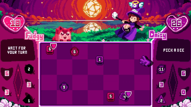 In this chaotic dice game, players battle by throwing their dice onto a board. But by hitting the other dice on the board you can change their values to your advantage, introducing an element of strategy on top of the luck present. At the end of the dice-throwing phase, each die will defend or attack the corresponding player. Battle until one or more players go down!
