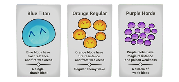 With 7 colours of blobs, each with their own resistances and weaknesses, and 4 types of wave modifiers, you’ll need to balance your defences to hold up against any potential threat.