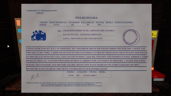 In 1904, the Lota coal mine in Chile captured the attention of the country's miners. Because food was scarce, and their needs were increasing, entire families sacrificed their lives inside the mine. In this game, you have a second chance at redemption, by twisting the fate of those who passed.
