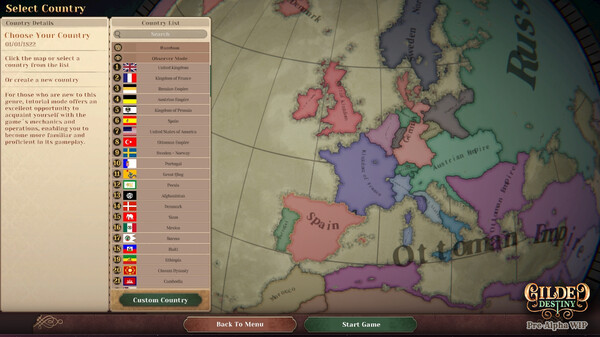 Gilded Destiny is a grand strategy game depicting the transformative era of the Industrial Revolution. You will take the helm of the country of your choice and transform it from a backward agrarian society to an industrial powerhouse.