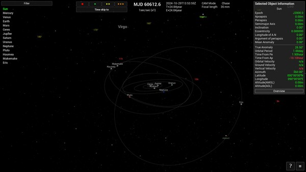 Travel through the solar system in your own spaceship! The motion of each celestial body is accurately reproduced by the Kepler equation. This demonstration is a tech demo.