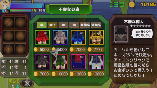謎の商人から購入できます。帽子、服、靴は装備すると見た目やスキルレベルが変わります。体力回復薬などの消費アイテムはインベントリを開いて使用します。