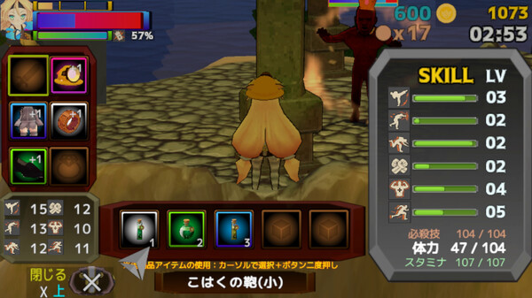 パンチ、キック、投げ、ガード、タフさ、スピードの6種類があります。対応した行動を取ることで経験値が溜まり、レベルアップします。各スキルレベルは装備品で底上できます。