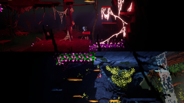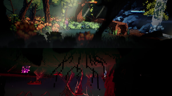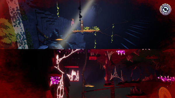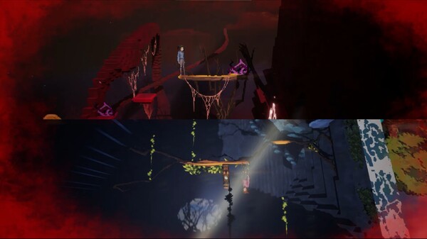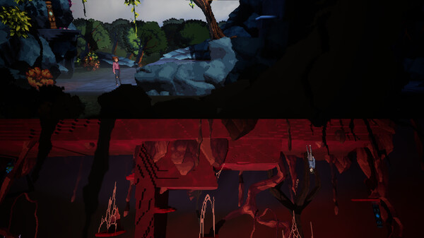 It’s 2.5D voxel and pixel art with real videos in the background. It has an innovative mechanic where the player controls two characters at the same time on a split screen. In both, the gravity is inverted. In this duality, anxiety disorder are reflected.