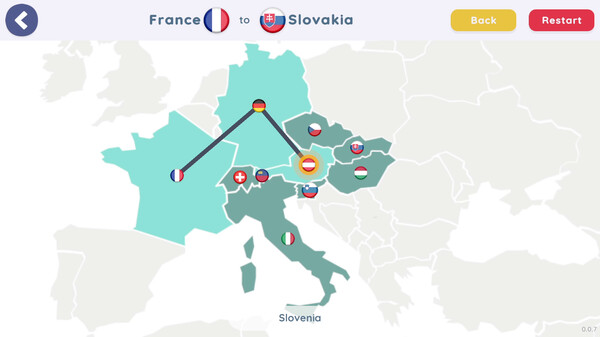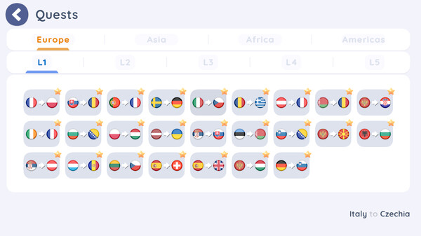 The country hopping quests start small. You get to familiarize yourself with different countries and their neighbours by searching 2-3 hop routes. As you level up, the quests get more challenging with routes that need handful of hops. You will find your geography skills improve along the way.