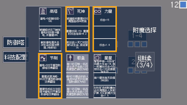 在开始关卡前选择不同防御塔,附魔和科技路线,获得不同关卡体验