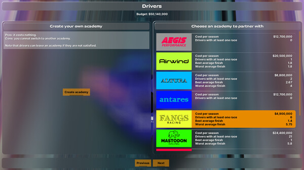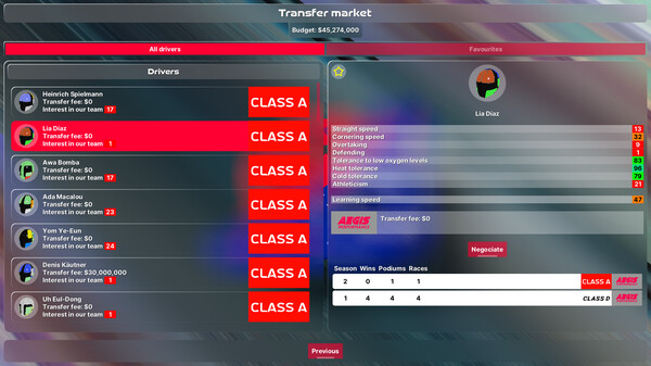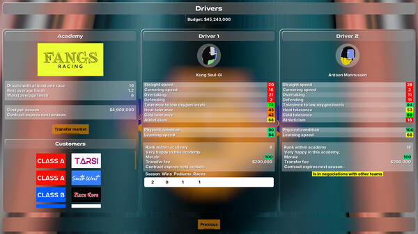 A racing team manager that throws micromanagement out of the window. Lead your team to victory in various championships while adapting to new challenges over the seasons. Also, bots don't cheat.