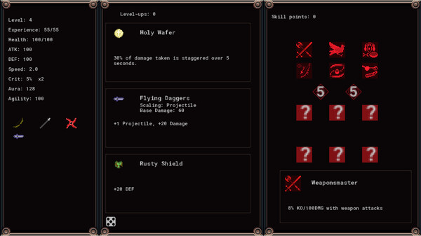 Levelups in Gravepact do not constantly interrupt your gameplay the way they do in most Survivor type games Open up your character screen at any time to spend your level-ups on new weapons, items and upgrades, as well as improve your skills. A + sign on your portrait will let you know if there is something new to be gained.