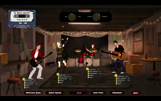 Do you want to be the top drawing live act? Focus on your guitar skills, on-stage charisma, and stage decorations. Or a world class songwriter/recording artist? Level up your song crafting skills and spend resources in the recording studio & on marketing.