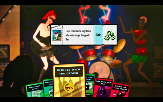 Compete in events against nightly traveling bands and the quarterly big boss local bands to become the top draw. Perform your bands greatest hits and wow the crowd. You'll have to read the room, play the songs that fit the mood of the audience. Then, while your rival performs, tune your guitars, mingle with the crowd to learn their thoughts, change your stage decorations, whatever it takes to achieve your dreams!