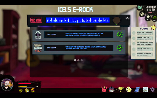 Tune into the radio to find the hottest events. Plan your day, manage your skills, gear, and relationships. Influence people, recruit band mates, and sometimes maybe even sleep. Head out and busk for cash, catch a movie, whatever inspires you. The world is open and only you can create your unique path to stardom. Every play through generates a new cast of characters that go about their lives you’ll need to engage with to gain the inspiration you, the artist, needs.