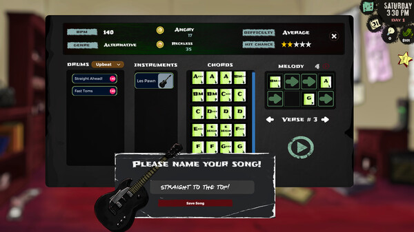 Writing songs requires lyrics and music. Choose your genre and then spend inspiration, thoughts and moods to make or follow trends. Select the drums, guitars and chords to write REAL MUSIC using the drag & drop song crafter. You'll have to rehearse and perform your songs on stage, like a real rockstar!