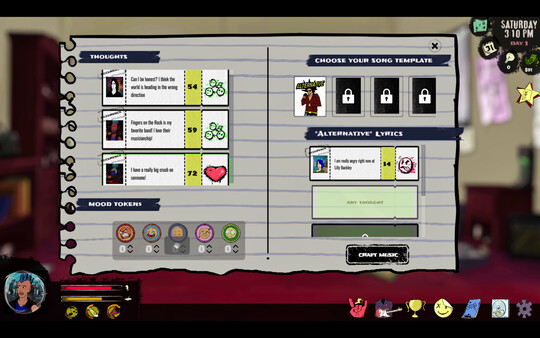 You'll use the things you learn about the world, other people, reactions, and moods from your notebook to talk to, influence, and build (or ruin) relationships. The secrets you can get them to share become the lyrics for your hit songs!