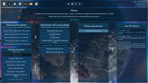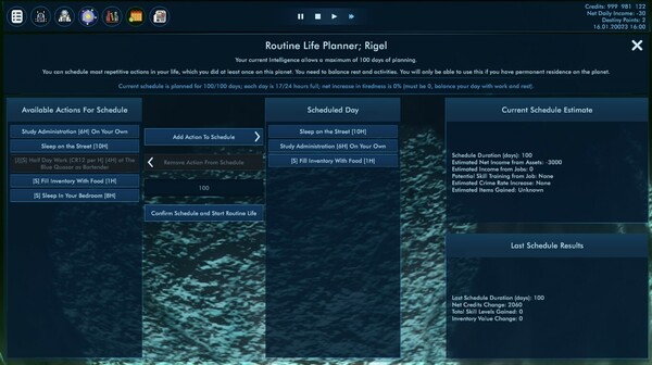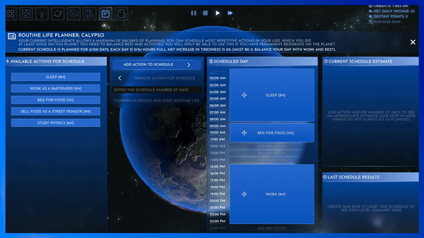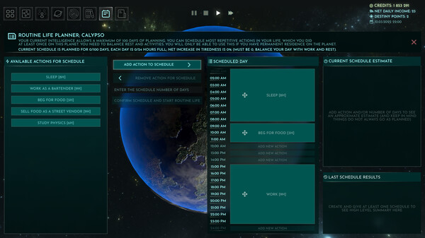 For more repetitive tasks utilize the Life Planner to schedule your actions, optimizing your routines for maximum efficiency. Build enterprises, master skills, and grow your wealth on the planet until you are ready to conquer space. Every day is a step toward your ultimate goal, which, funny enough - you do not know.