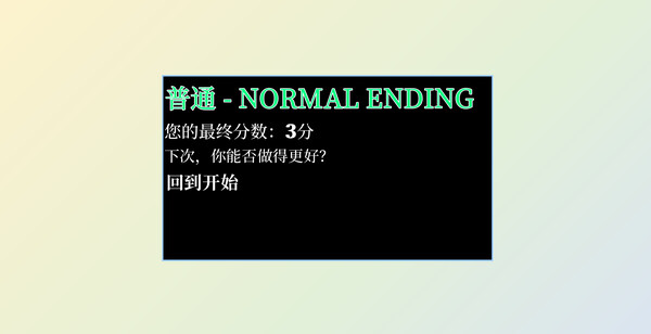 游戏通过您的选择将会触发PE完美结局,NE普通结局,BE坏结局。通过得分机制,了解你的选择正确与否。