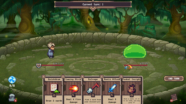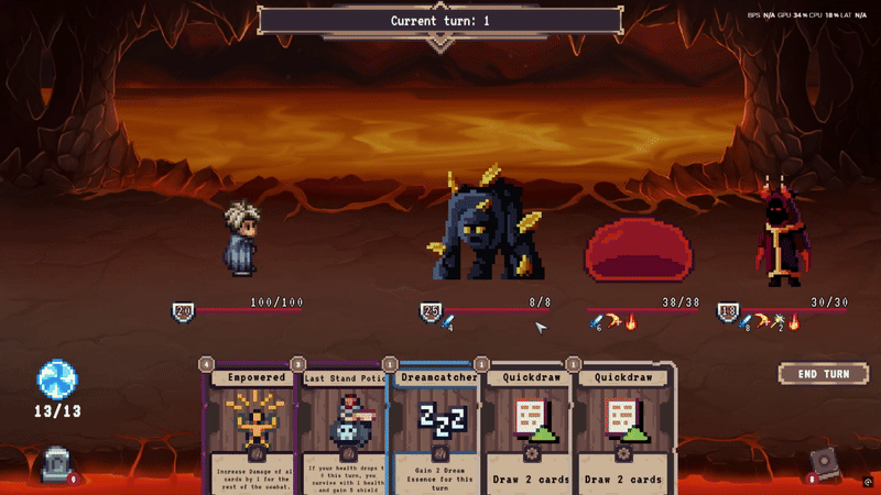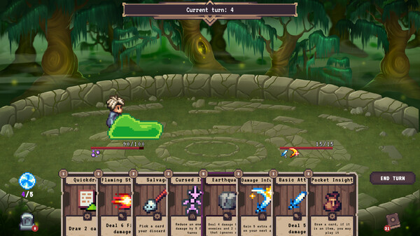Turn-based combat with animated enemies. Face different elemental foes with special Moves: Stuns, poison, burn, deck disruption, and more - forcing you to adapt as you progress.