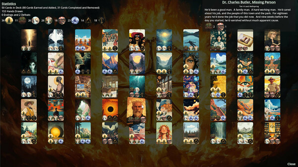 Solve mysteries to earn new and better cards and remove weaker cards from your deck.