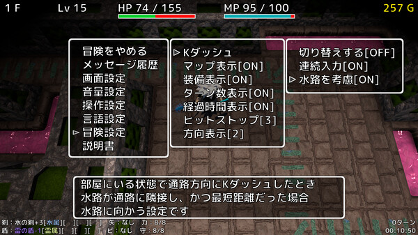 The game has Classic Roguelike A procedurally generated dungeon that changes shape every time you enter. We prioritize smooth controls and pacing, allowing for stress-free adventures with our special fast-movement feature (known as K-Dash). Whether you prefer to move quickly or take your time, the turn-based system accommodates both playstyles.