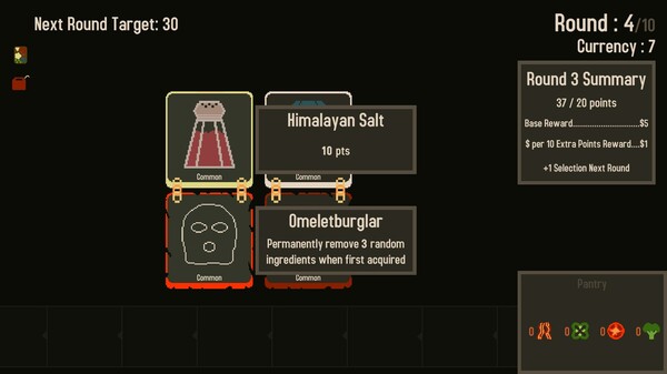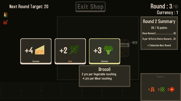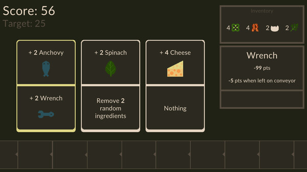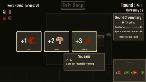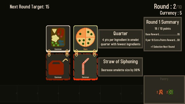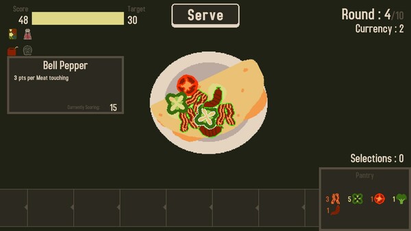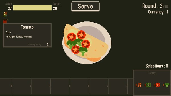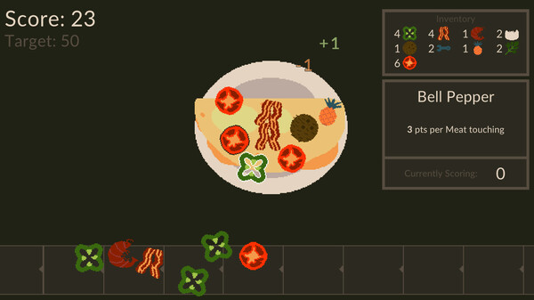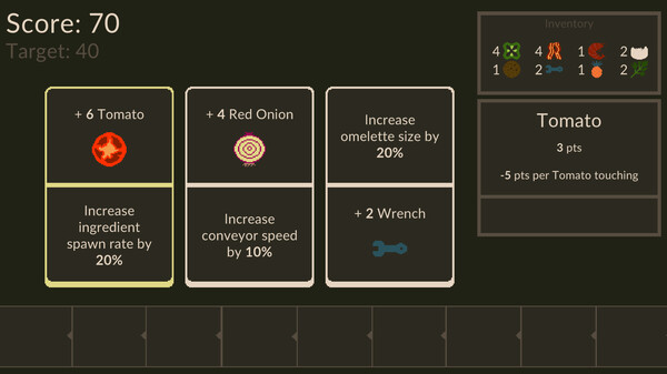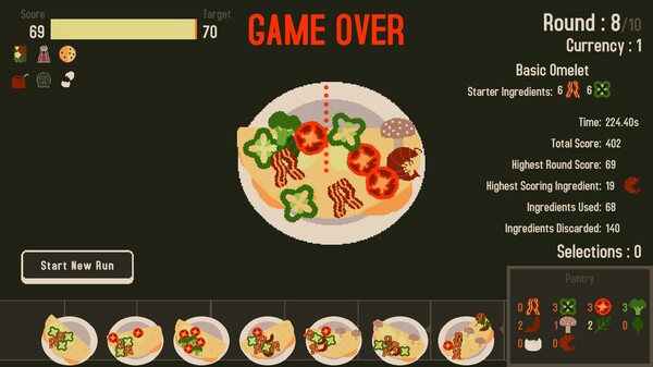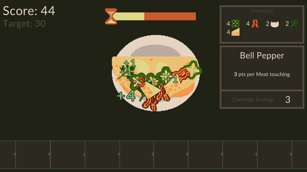 Each run starts with just a few ingredients. Maybe you're cooking up a bacon and bell pepper omelet. Easy peasy. But now you need to make a choice. Do you want the broccoli that pairs nicely with your bell pepper, or would you rather go with the ham for a meat-lover build? Your omelets will become increasingly complex as you chase that target score.
