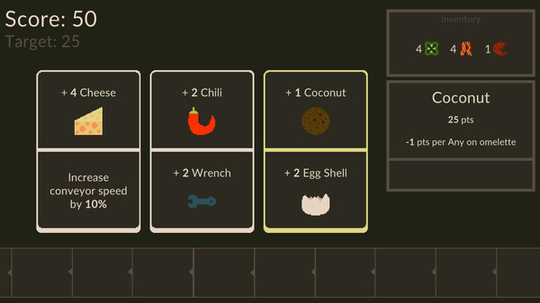 Assemble the perfect omelet in real-time using ingredients from a conveyor belt. Unlock ingredients, try out new combinations, and overcome wrenches thrown in your operation. Each run offers different opportunities and challenges as you discover game-breaking omelet combos