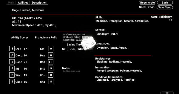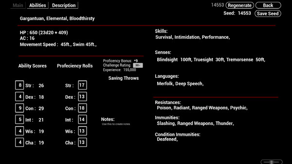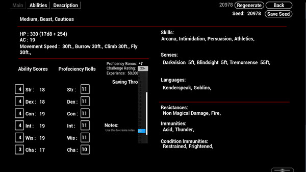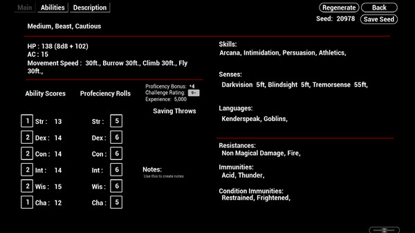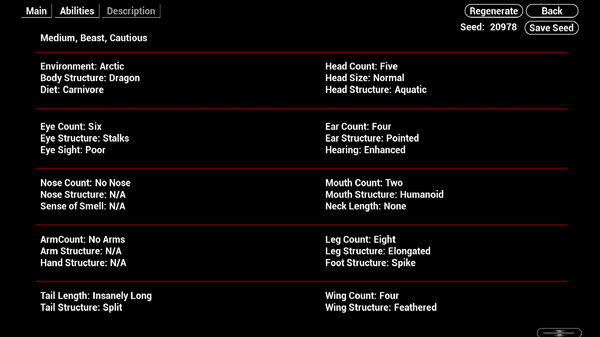 This is an application to allow the instant creation of creatures to bring to your table top rpg campaigns to encite the unknown to your players. This is not a full fledged game on its own, but you will be able to roll dice for its stat block and attacks. You will be able to save creatures that you have made, and even share the seed generated by each unique creature so others can view or use it for their campaigns.