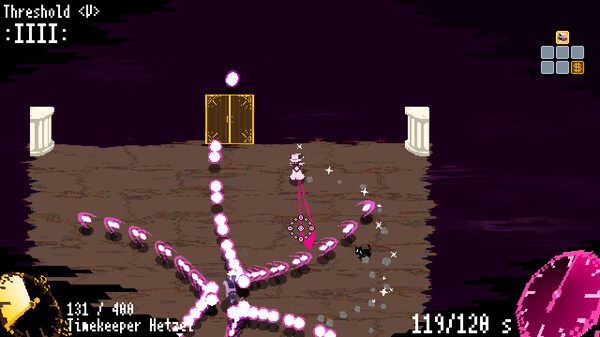 The game has Time Snatcher Handy is a Timestop Bullet-hell Roguelike.