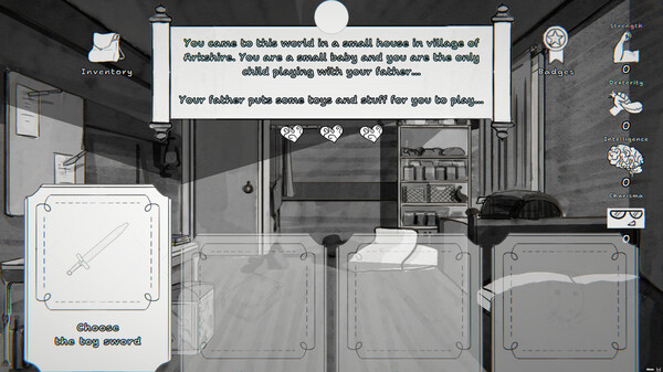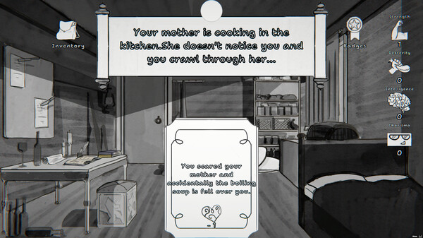 Born as a baby. Learn how to live and find your way to survive. You can build your strength, dexterity, intelligence and charisma for though situations. Or You can roll a dice and try your luck.