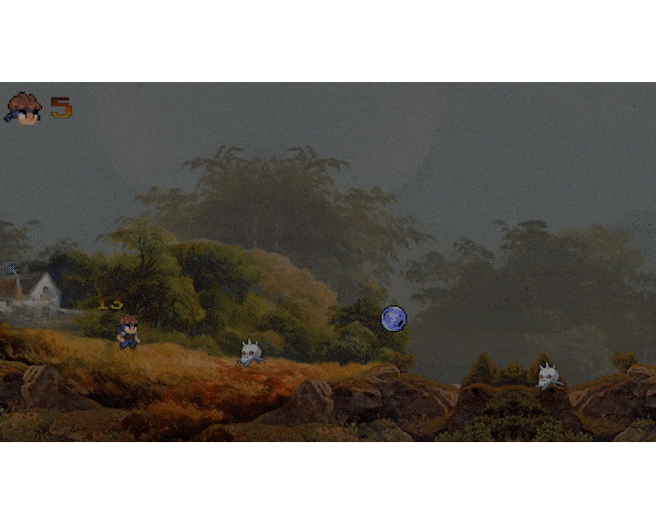 The game has Shadow Dash is a retro 2D action platformer with PIXEL-ART characters on OIL PAINTING backgrounds and changing game controls.