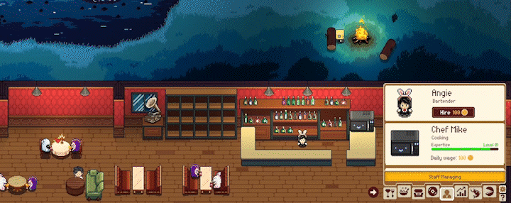 Stock on goods and hire staffs to automate all the work while you chill out in the backyard. Unwind while managing the bar, a worry-free experience of bankruptcy. Or is it?You can either play in full screen or let it sit at the bottom of your screen, immerse in the vibe while you do other things other things on your PC.