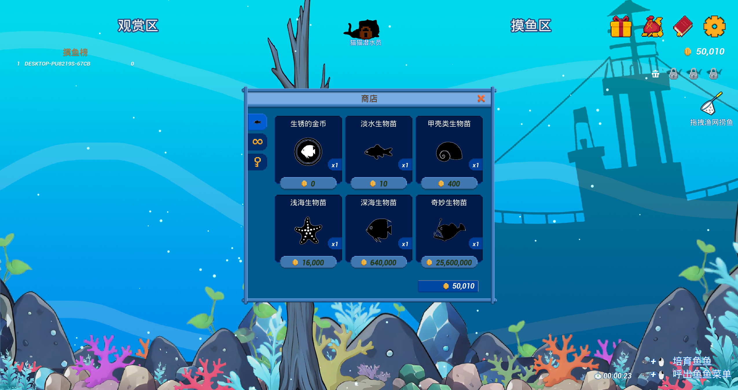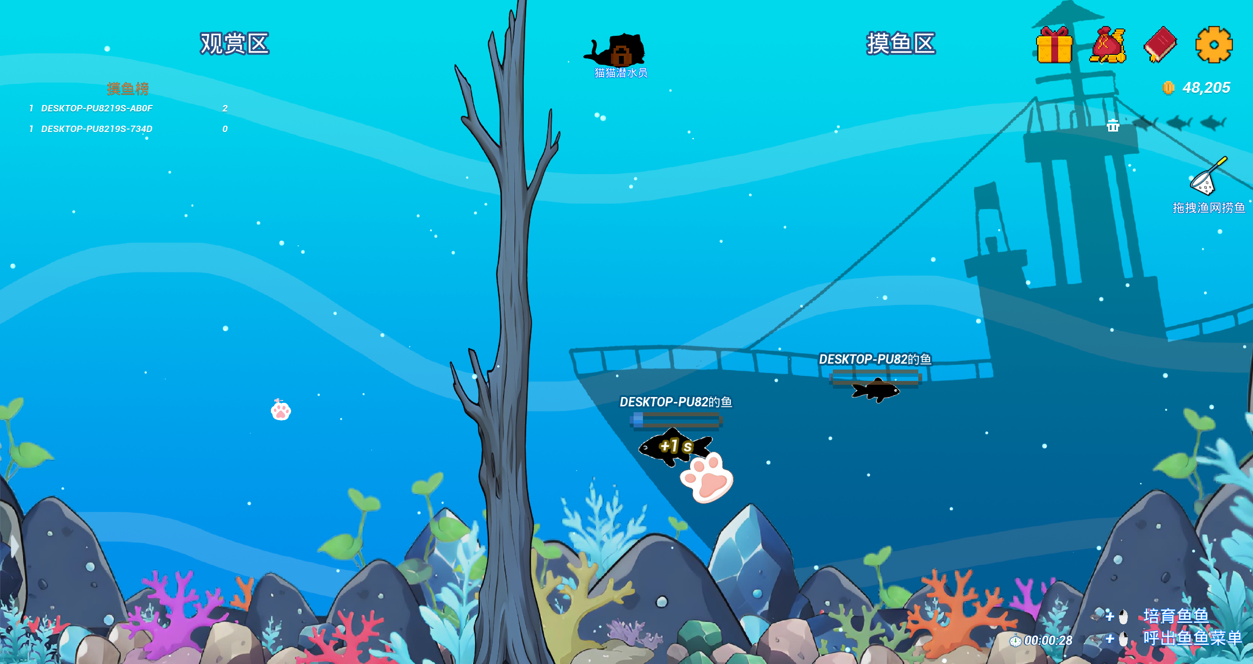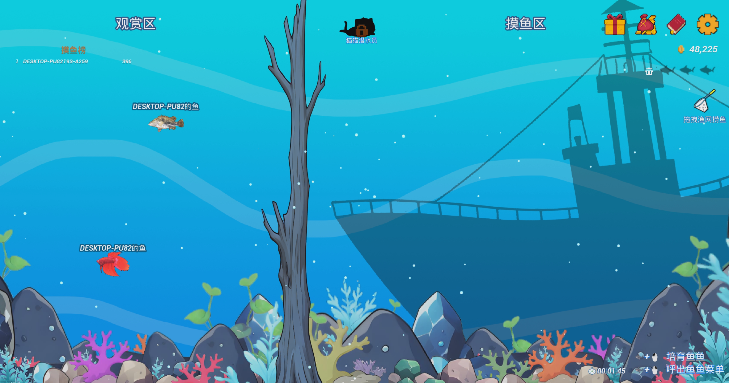 Team up and slack together with your friend! You may join a friend's room or a stranger's room, and enjoy touching your fish in spare time!