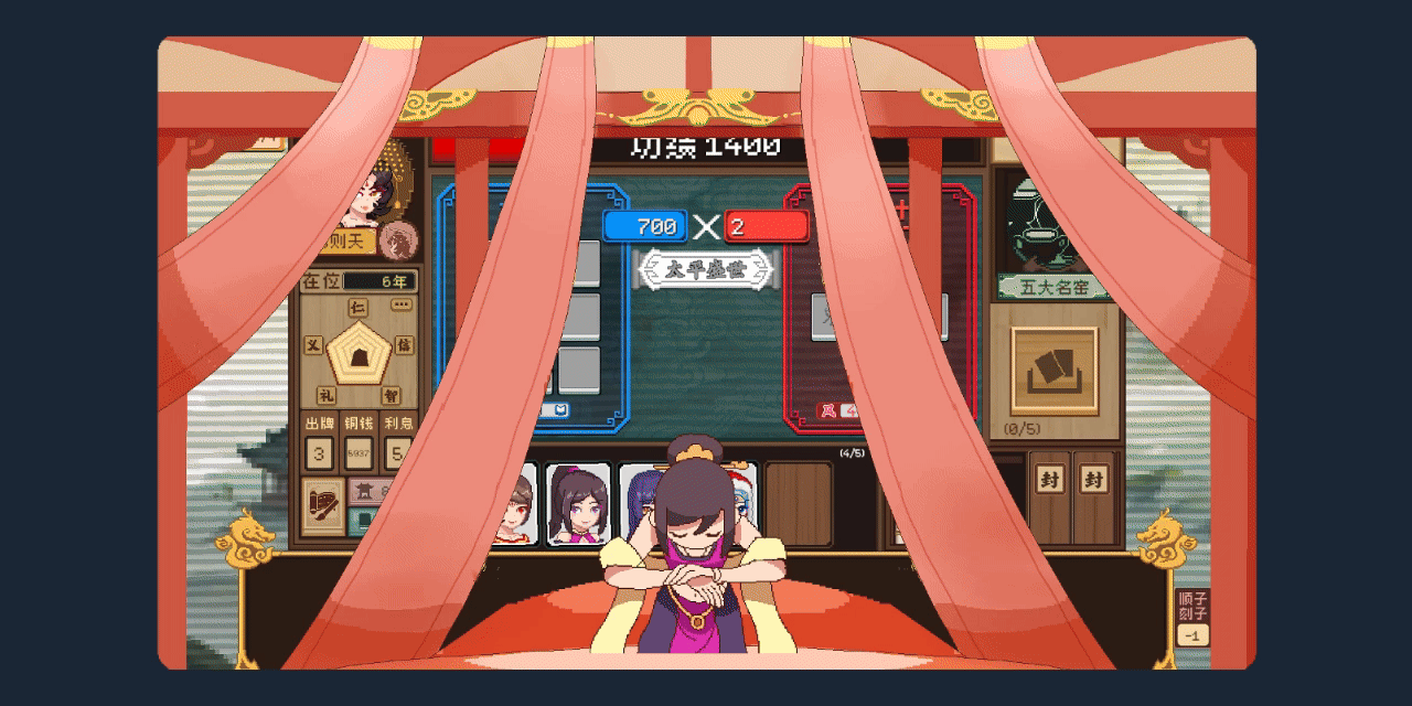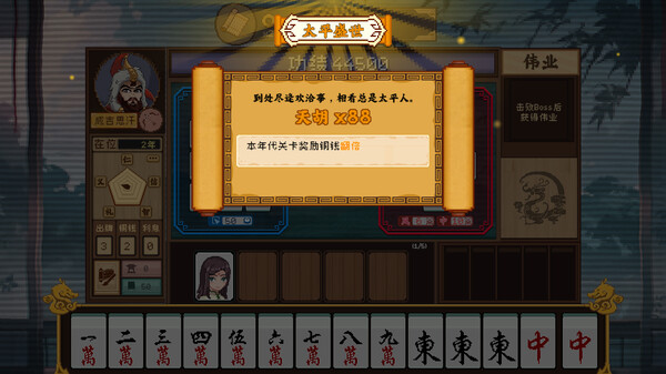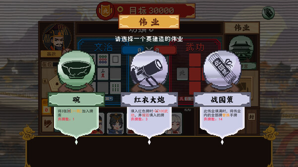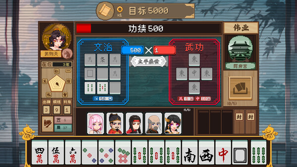 皇帝麻将是一款中国历史题材的牌组构筑游戏,以传统麻将为基础,展现帝王之路的博弈与权谋。在游戏中,你将扮演有名的君王,搭配各具才能的大臣、伟业,提高文治与武功,抵御天灾人祸,创造属于你的太平盛世!