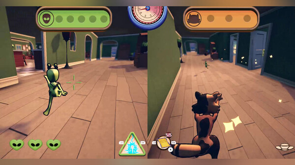Green Thing from the Planet Jupiter is a fast-paced two-player competitive chase game where players take on the roles of Cannoli, a crafty housecat, and Green Thing, a stranded alien engineer. Cartoonish chaos meets strategic gameplay as Green Thing scavenges parts from around the house to repair his UFO while avoiding Cannoli and his traps.