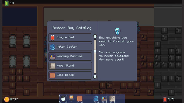 Use the Bedder Buy catalog to buy beds and other items for Flip to build in the inn. Purchase upgrades for Flip and other parts of the inn to improve efficiency.