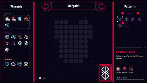 A meta-progression system where you unlock Warpaint runes that modify and amplify your characters' abilities. It features an inventory management system, challenging you to fit as many effective runes as possible into a limited space, maximizing their impact on your abilities, playstyle, and strategy.